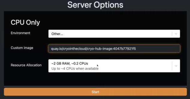 Paste the tag into the Custom image field on CryoCloud. For reference, this image is built from the code in: https://github.com/CryoInTheCloud/hub-image.