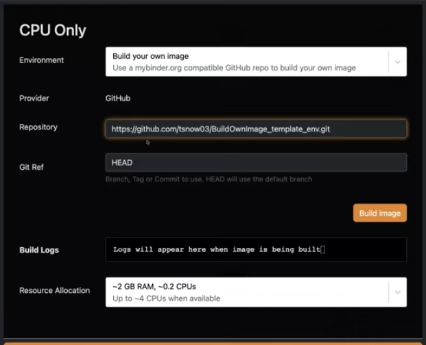 When launching CryoCloud, select Build Your Own from the Environment dropdown. A field labeled Repository will appear. This is where you will paste the URL of a GitHub repository that contains an environment.yml file.