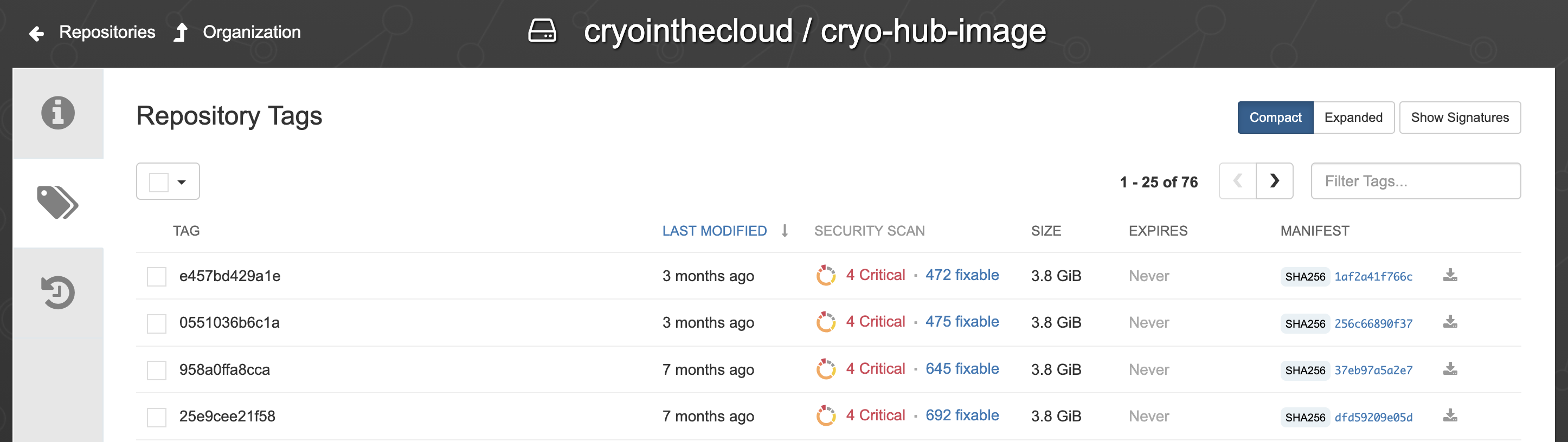 1. Visit the repository tags page: https://quay.io/repository/cryointhecloud/cryo-hub-image?tab=tags